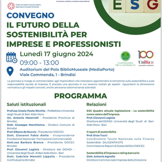 Lunedì 17 giugno 2024, dalle 09:00 alle 13:00, si terrà presso l'Auditorium del Polo BiblioMuseale (MediaPorto) di Brindisi un convegno sul futuro della sostenibilità per imprese e professionisti. Organizzato dall'Università degli Studi di Bari Aldo Moro e dal Dipartimento di Economia, Management e Diritto dell'Impresa (DEMDI), in collaborazione con Confindustria Brindisi, l'evento è rivolto a commercialisti, imprenditori e professionisti interessati ad approfondire le tematiche della sostenibilità e della responsabilità sociale d'impresa. Il programma prevede interventi di esperti del settore, testimonianze aziendali e un approfondimento sugli aspetti normativi e impatti concreti della sostenibilità.