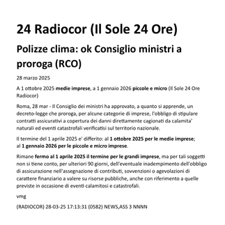 Il Consiglio dei Ministri ha approvato una proroga per l'obbligo di stipulare polizze assicurative contro i danni da calamità naturali. Le medie imprese avranno tempo fino al 1 ottobre 2025, mentre le piccole e micro imprese fino al 1 gennaio 2026. Nessuna proroga invece per le grandi imprese, ma per 90 giorni non si terrà conto dell'inadempimento per l'accesso a contributi pubblici.